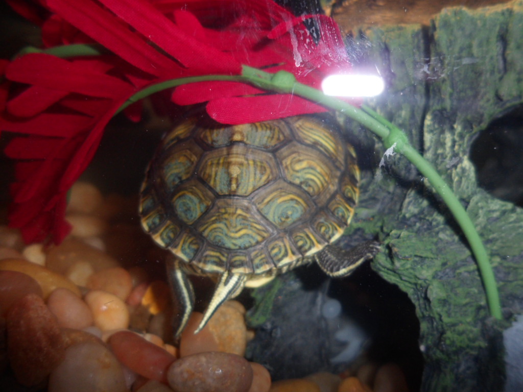 My mom has a turtle, and it's in a HUGE tank, over 100 gallons, and it's HUGE now…he was a little bigger than Pokey to begin with, but we had to change his tank out a few times…